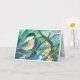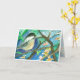 A pretty Happy Birthday greeting card featuring chickadees perched in a blooming fruit tree exploring the spring landscape with shades of deep royal blue and indigo drawn in ink with watercolor.