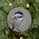 Adorable black-capped chickadee perched on a branch in a pine tree with a sunflower seed