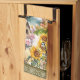 Blush pink chickadee towel - scenic mountain village. Sunflowers and cherry blossoms. Part 4 in a series of songbird towels.