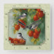 Birds in the apple orchard during the autumn harvest. Two black-capped chickadees perch in an apple tree while a third chickadee sits on a basket filled with ripe, freshly harvested fruit ready for market. All on a cheerful green patterned background. Realistic artwork created from an original oil painting by wildlife artist Crista S. Forest.