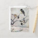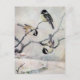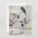 Three black-capped chickadees (Poecile atricapillus) cling to twigs in the middle of a snowstorm in this vintage illustration from 1920. One seems to be wondering why the other is hanging upside-down.