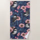 Chickadees in the wild rose in pink and blue beach towel