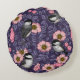 Chickadees in the wild rose in pink and violet round cushion