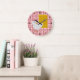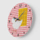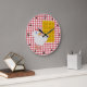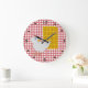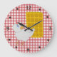 Fun kitchen wall clock done in a red and white gingham table cloth look pattern, with black numbers and dots, around the edge. Cartoon graphics of a big waffle and a little white chicken decorates the face of the clock. Customise to add any text you want. Makes a fun gift idea for any southern food lover.
