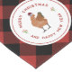 Illustration of a chicken wearing a Santa hat surrounded by "Merry Christmas and happy new year" arched text and holly berries over white circle with red border. Background is red and black buffalo plaid pattern.