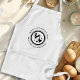 Bib apron with pockets and black chicken farmer design. A rooster, hen and chicks image inside a black circle is the design. Black text curves around the top and bottom of the design. Use for a farm name and address / location, or any text that fits.