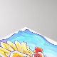 Animal Parade Chicken brought to you by ITD Animal Parade features our original art of a cute yellow and golden chicken standing in a barnyard in front of a red barn and fence with a textured blue sky with a playful wavy purple border. Painted by our talented children's artist, Traci Van Wagoner.