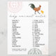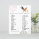 Baby shower match game featuring illustration of baby chick with mama hen and pink and sage boho designs at corners. Baby chick is wearing a pink bow. Match the animal names to the baby names.