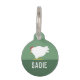 This pet ID tag features an adorable chicken design on a green background with space for a pet's name to be added. It's a cute and fitting choice for a backyard chicken keeper or anyone with a fondness for farm animals, offering a playful and personalised way to ensure their feathered friend's safety.