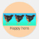 Thee barred rock hens marching in an ink and pastel drawing surrounded by warm colour and fun wishes.