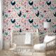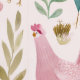 Charming cottage-style wallpaper featuring a whimsical chicken and floral pattern in soft blush pink, teal, and neutral tones. Perfect for kitchens, nurseries, or farmhouse-inspired spaces, this seamless design adds a cozy yet elegant touch to any room.