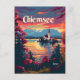 A charming and nostalgic depiction of Chiemsee, a beautiful lake in Bavaria, Germany, known for its crystal-clear waters and scenic surroundings. The design captures the lake's serene beauty with views of the Fraueninsel (Island of Women) and Herreninsel (Island of Men), featuring historic buildings like the Frauenwörth Abbey and the majestic Herrenchiemsee Palace. Rendered in a vintage style, the artwork evokes the tranquil atmosphere and cultural richness of Chiemsee, inviting viewers to experience its idyllic landscapes and historical landmarks.