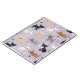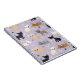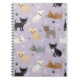 Cute chihuahua dogs in black, brown, tan, cream, grey and blue coats sit and stand scattered dog bones and paw prints on a light purple background.