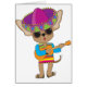 A happy Chihuahua with foot tapping and tail wagging, is playing the guitar while in show costume, complete with a large Mexican sombrero.