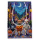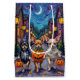 Adorable Chihuahuas dressed in playful Halloween costumes carry pumpkin buckets while trick-or-treating under the moonlit sky. This festive design highlights the breed’s tiny size, big personality, and lively spirit, perfectly capturing the spooky yet fun atmosphere of Halloween night. A charming celebration for dog lovers and Halloween fans alike.