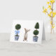 These greeting cards feature a watercolor portrait of a tan short haired chihuahua sitting in between two chinoiserie style topiaries.