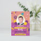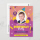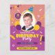 This is a Child Photo Birthday Post Card Invitation Card with birthday hat, balloons, gift and candies on the front.