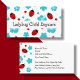 Daycare business card template in bright and fun design including cute ladybugs, flowers, and hibiscus flowers in turquoise, Red, and wbite. Highlights your company name on the front and displays your daycare details on the flip side. Designed as a daycare or babysitting design.