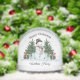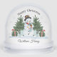 This personalized snow globe is a suitable keepsake for a young grandson or son. The design on the front and back includes a watercolour festive scene of snow, Christmas trees, candy canes, blue Christmas gifts, and a snowman with hat, scarf and ornaments.