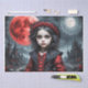 This design features a young witch dressed in black and red, set against a dark and atmospheric backdrop. The scene is illuminated by two distinct moons—a blood-red one and a pale white one—casting an eerie glow over the surroundings. The title, "Child of the Dual Moons," evokes a sense of mystique and enchantment, capturing the essence of a character born under these contrasting lunar influences. Ideal for Halloween or any project with a gothic and magical theme, this design blends elements of darkness and otherworldly beauty, perfect for creating spellbinding art and décor.