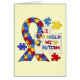 A puzzle piece that reads 'I Love a Child With Autism", puzzle pieces of blue, red, and yellow and the autism awareness ribbon on autism awareness T-shirts, hoodies, mugs, magnets, cards, stickers, bags, keychains, buttons, and other items.