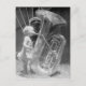 This is a vintage photo of a small child blowing into the mouthpiece of a tuba, an instrument much larger than the child.