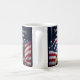 Determined all-American kitty wearing an Uncle Sam stars and stripes hop hat surrounded by American flags with editable "Childless Cat Ladies of America" text.