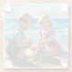 Adorable watercolor ai art depicting two children building a sandcastle on a beach with a pretty cloudy background and the sun reflecting off the ocean water. Cute nostalgic art to give you a vintage vibe.