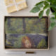 This design features a painting by the British Victorian artist John Lee (active 1850–1870), who worked in a Pre-Raphaelite style. It depicts two children, a girl and a boy, travelling to market in a beautiful rural landscape. The girl is riding on the back of a donkey, and she is carrying wooden baskets, which will hold the produce bought at market. The boy is walking alongside his sister and her donkey; he is carrying a bag on his back. They are travelling through a farmer's field, and an animal can be seen grazing on the grass in the background. Further back there are tall trees and mountains. The mountainous landscape and the children are possibly both intended to be Welsh.