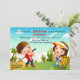 A vibrant, juvenile invitation just perfect for a golfing birthday celebration. The card features a boy swinging a golf club and a little girl with a golf bag on a golf course.