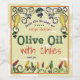 Hippie doodle style olives and olive oil can and colourful chile or chilli peppers on this flavoued olive oil home canning label with your choice of background colour, personalised with your name and text.