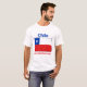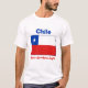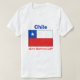 An editable title and slogan accompanies the white and red bands with white star over blue canton of the Chilean flag on the front of this t-shirt. The back displays a detailed map of Chile.