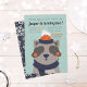 Brrr! Frosty chic invitations for kids' winter birthday celebrations feature an adorable rosy cheeked racoon dressed in a cute winter hat and scarf. "Come chill out with us" appears across the top in navy blue lettering, with your party details beneath in a cool mix of navy and orange typefaces.