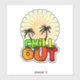 Graphic art of a silhouette of 2 palm trees with the sun shining behind and the words Chill Out