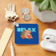 This adorable keychain features a cartoon capybara sitting in an orange pot next to a green plant. The capybara is holding a red book and appears content, with the word “RELAX” above it in bold, light blue letters. This keychain is perfect for capybara lovers and those who enjoy a relaxed, bookish vibe. Made from high-quality materials, it’s a delightful and durable accessory for your keys, bag, or backpack.