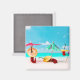 Three red chilli peppers on the beach. Hot sunny day, blue sea, white sand, umbrellas and sombreros. Two peppers are drowsy under beach umbrellas, the third one is waistdeep in the water. Every hour is a happy hour at the beach. Sun, Sea, Sand, Sombrero. Square format products and gifts