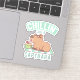 A cute doodle of a capybara with sunglasses relaxing on a beach towel drinking a fresh coconut drink. The funny caption reads "Chillin Like A Capybara".