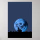 silhouette of a chimney sweep at work on the rooftop of a housing estate with moonlit sky in background