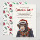 Capture the enchantment of the holiday season with this chimpanzee Christmas invitation, a whimsical and heartwarming addition to your festive celebrations. This charming card features a chimp adorned with a Santa Hat and decorated with a red poinsettia garland, set against a snowy winter scene.