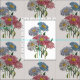 Old-fashioned botanical illustration of China asters in pink, white and blue.