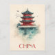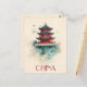 This travel postcard is inspired by the Chinese temples. There is a three-story red temple illustration in watercolor style.
