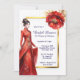 A beautiful watercolor graphic of a Chinese bride wearing a red and gold cheongsam bridal gown with decorative floral detail has her dark hair swept up into a bun on top of her head that has a pretty decorative band around it. She is holding the side of her bridal gown skirt in one hand and is framed by a faux gold white rectangulr frame resting on a white background. A single large red and faux gold flower appears in the top right corner and below that are black calligraphy script and roman style black templates for your custom wording. This design is ideal for elegant; simple; floral or botanical red and gold bridal showers. Feel free to change the background and font colour to any colour of your choice to suit your special occasion.