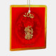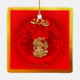 Golden Rabbit paper-cut into a decorated circle with Chinese lantern and Fu ideogram (meaning Luck), blossoms and Chinese greeting into small circles under the Rabbit + "Year of the Rabbit" in hand writing style onto a golden textured paper (image printed). Design on square ceramic ornament for Chinese New Year of the Rabbit 2023. Matching greeting card, postcard, square flat card, party supplies and more...