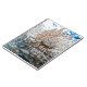 A false-colour, HDR (high definition range) infrared photo of a Chinese garden with a waterfall and a pavilion in an Asian park. The foilage of the trees is white due to the infrared photography. The alover colour scheme is reminiscent of a sepia photography.