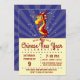 Cute red and yellow Chinese dragon on blue rays with white fireworks for fun New Year Party or birthday celebration.