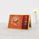 An elegant visual of a horse in red with blossoms into a circle (inspired by traditional Chinese paper-cut) with gold circle (image printed) overlay a red and yellow traditional Asian pattern + graphic "HAPPY NEW YEAR" in Chinese and English and old Chinese calligraphy for "horse" on the right on gradiant red colour band. Inside are the same gradiant background for texts to personalise. Design on horizontal greeting card. You can easily personalise this Lunar New Year folded card by customising the greeting on inside the card or delete for your handwritten note. Available similar design with golden paper cut-out of snake. Matching real foil greeting card.