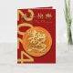 Simple and modern design with a golden Dragon paper-cut into a large "wooden" circle + Large 2024 in vertical position + Greeting in Chinese + golden "Year of the Dragon". Design on greeting card. Matching holiday postcard and more...