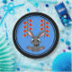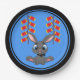 Chinese New Year plates for the year of the black rabbit with a cute rabbit and firecrackers, blue background, and black border.