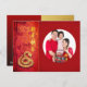 Decorated background image in orange red tones with bamboo silhouette and golden texts: wishes in Chinese, customisable 2025 and Snake paper-cut + decorated photo frame for your own photo + personalised wishes to customise. You can easily change photo and text (font, size, colour and position) by clicking the customise button. Design on holiday postcard.