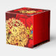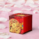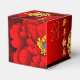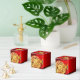 Design of Chinese peonies + golden Rabbit paper-cut circle (image printed) + Large red peony + Happy New Year in Chinese and English + customisable 2023 + Family Name and message to customise onto a red background with auspicious clouds. Design on cube favour box. Perfect for Chinese New Year of the Rabbit 2023.